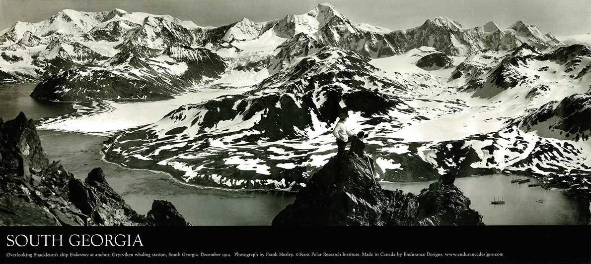 The Endurance can be seen at anchor, far below, near Grytviken whaling Station. Grytviken, the whaling long since abandoned, is now home to the South Georgia Museum, a favourite destination for Antarctic visitors and adventurers.
